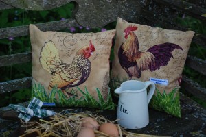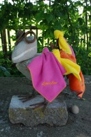 Abstauber (Staubtücher fürs Auto) in poppigen Farben. Kissen mit diversen Motiven in vielerlei Größen. (Kater Franzl – nicht im Angebot. Miau!)