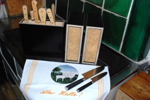 Stylische Messerbox aus schwarzbraun geleimtem Echtholz und 4317 Schaschlikspießen die jedem Messer seinen Platz und Halt geben.